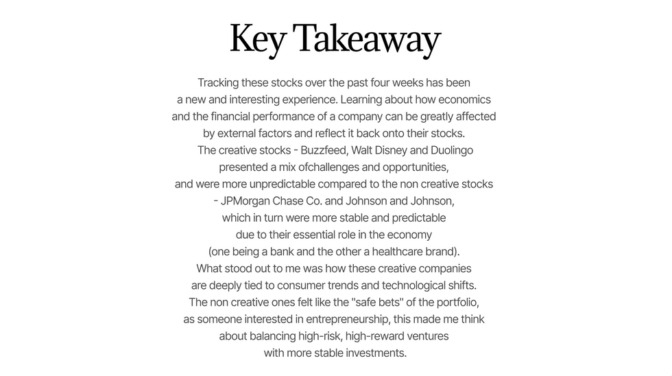 In this hands-on financial analysis exercise, I created a simulated investment portfolio with $10,000 in capital, strategically allocating funds across five carefully selected companies. Over a four-week observation period, I conducted in-depth research on each company's current market position, historical performance, and brand trajectory to inform my investment decisions.